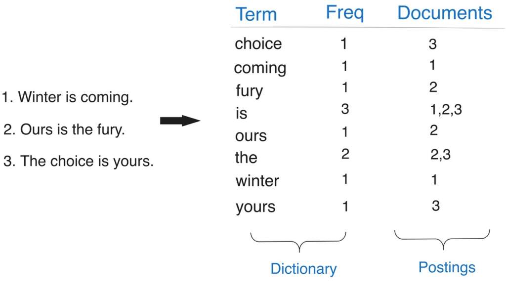 Postings (terim listeleri) oluşturma: Her terim için geçtiği dokümanların ID’lerini, frekanslarını ve varsa pozisyon bilgilerini içeren bir posting list oluşturulur. Bu yapı sayesinde aramalar doküman taraması yerine doğrudan ilgili terimin listesine erişilerek çok daha hızlı yapılır.