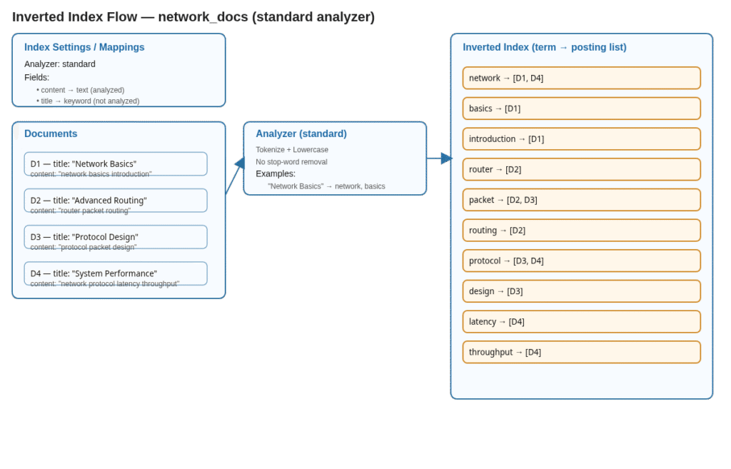Elasticsearch aynı mantığı daha gelişmiş analizörler, pozisyon bilgisi ve scoring ile gerçekleştirir. Mapping aşamasında kullandığınız analyzer tokenizasyonu belirler ve sonrasında sistemi otomatik olarak bir inverted index oluşturur.