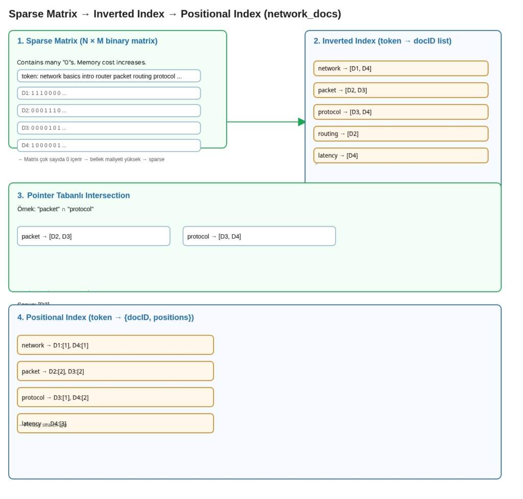 Buna çözüm olarak, araştırmacılar matrix’i doğrudan saklamak yerine sadece her token ifadelerin geçtiği dökümanların ID listesini tutmayı tercih etmişlerdir. Böylece gereksiz 0 değerleri depolamaktan kaçınılmış ve hafıza kullanımı önemli ölçüde azaltılmıştır. Bu yapının literatürdeki adı inverted index olarak adlandırılır.