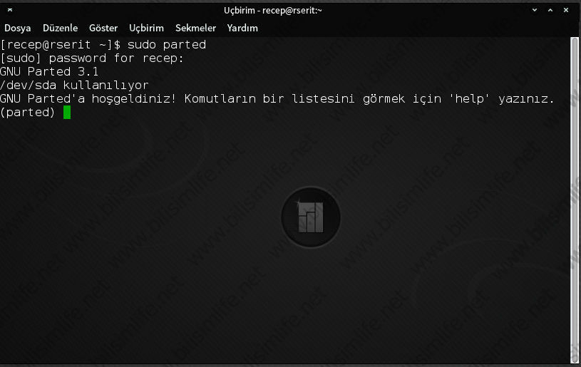 Komut arayüzünde “sudo parted” yazıp yönetici olarak giriş yaptıktan sonra karşımıza gelir.