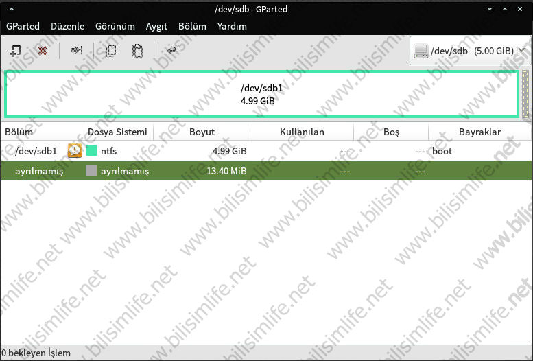 Yukarıdaki Resim 6’da bağlı görülen arabirim şu anda GParted üzerinden bağlantısını kesmiş durumda.