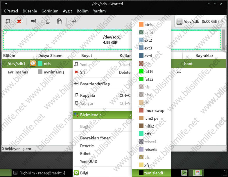 Bu komutu şöyle açıklayalım, sdb1 benim bağladığım diğer disk. GParted üzerinden bu rahatça görülebilir. Bunun ilişkisinin kesilmesi gerektiğini vurguladım.