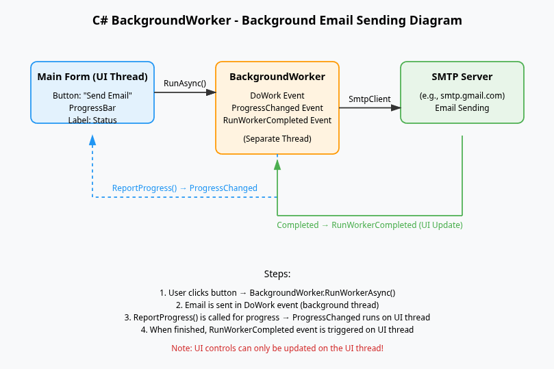 Bu yapıda sorunlar var. Birincisi BackgroundWorker UI thread ile bağlantılıdır. Örnekte WinForm mevcut ancak web uygulaması da olabilir. Uygulama kapanırsa veya restart olursa arka plan işlemi anında kesilir ve mail gönderilmez. Yarım kalmış işlem kaybolur, nerede kesildiği bilinmez ve tekrar başlatılmaz.