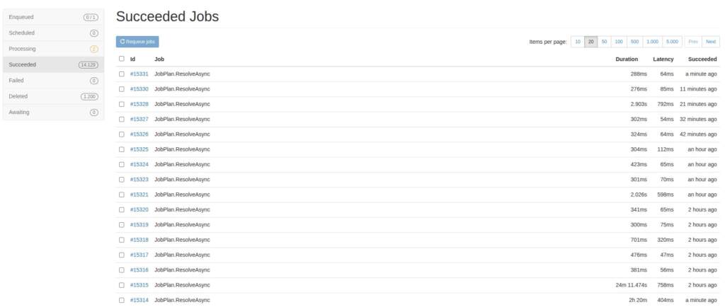 Job yönetimi için örnek bir paneli aşağıdaki gibi görebilirsiniz. Her gün belirli periyotlarda çalışan 11 adet “recurring job” bulunuyor. Tümünün yönetimi tek bir panel üzerinden yapabiliyoruz.