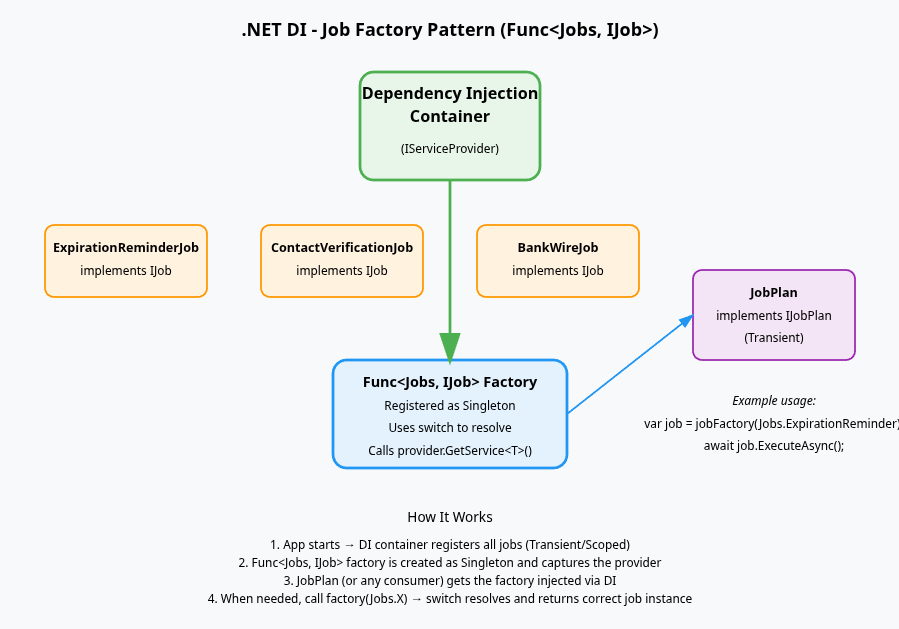 builder.Services.AddTransient<IJobPlan, JobPlan>();Bu yönteme “factory delegate” denilir. Enum ile job sınıfının tipini belirleyip, doğru job sınıfını DI üzerinden resolve eden bir factory oluşturur ve job çalıştırma mantığını ölçeklenebilir ve test edilebilir hale getirir.