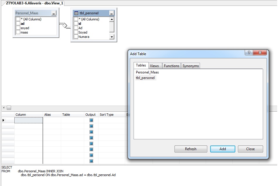 Tables kısmında veritabanının tabloları, Views kısmında önceki görünümler, Functions kısmında tablodaki fonksiyonları görebiliriz. Biz daha çok Tables kısmıyla ilgileniyoruz. Burada bulunan tabloların üzerine tıklayıp Add deyince bize bunu view olarak aktarıyor.