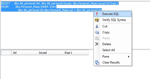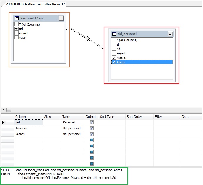 Şimdi tablolar görünüme eklendi. Burada bütün sütunları görebiliyoruz. Bir tablomdan bir sütun seçip, diğer tablomdan farklı sütunları seçebilirim. Seçildikten sonra aşağıda direkt olarak kod çıktısı geliyor.