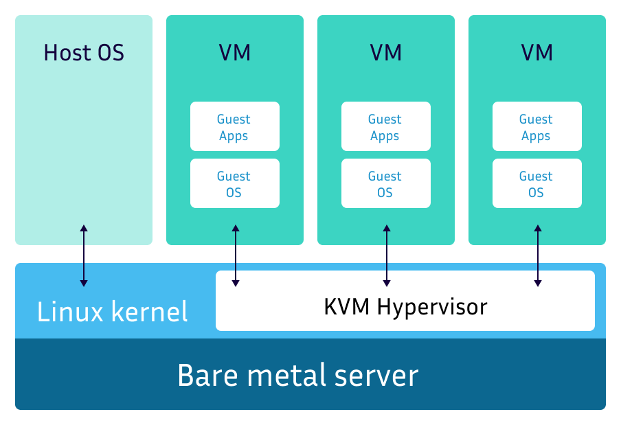 Bir KVM hipervizörü, her bir sanal makineye tam sanallaştırma teknikleri sunar. İşlemci, bellek, depolama, ağ kartı gibi donanım bileşenleri de dahildir.