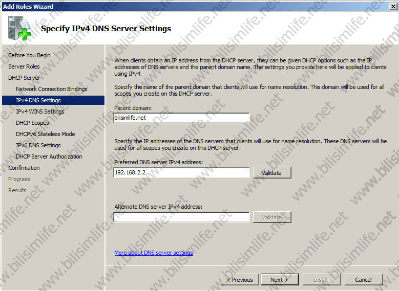 DHCP Server kurulmadan önce ayarlara gözatmanız açısından özet burada yer alıyor. Install diyerek kuruluma başlayalım.