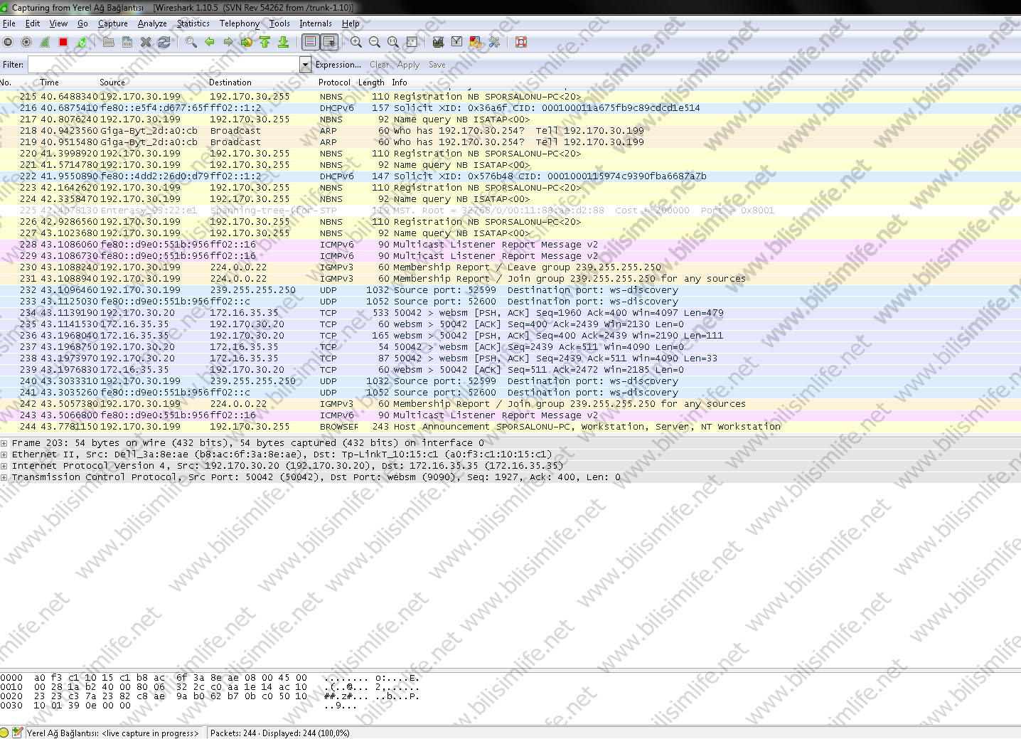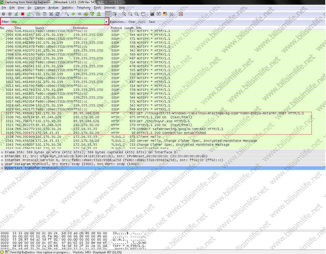 Peki paketler ne işe yarıyor? Şöyle ki, aynı ağda bulunduğum kişi hangi protokolü kullanırsa görebilirim. http protokolünü kullanması web sitelerde gezdiğinin göstergesidir. Örnek olarak BilişimLife’a girip bir makale açtım.